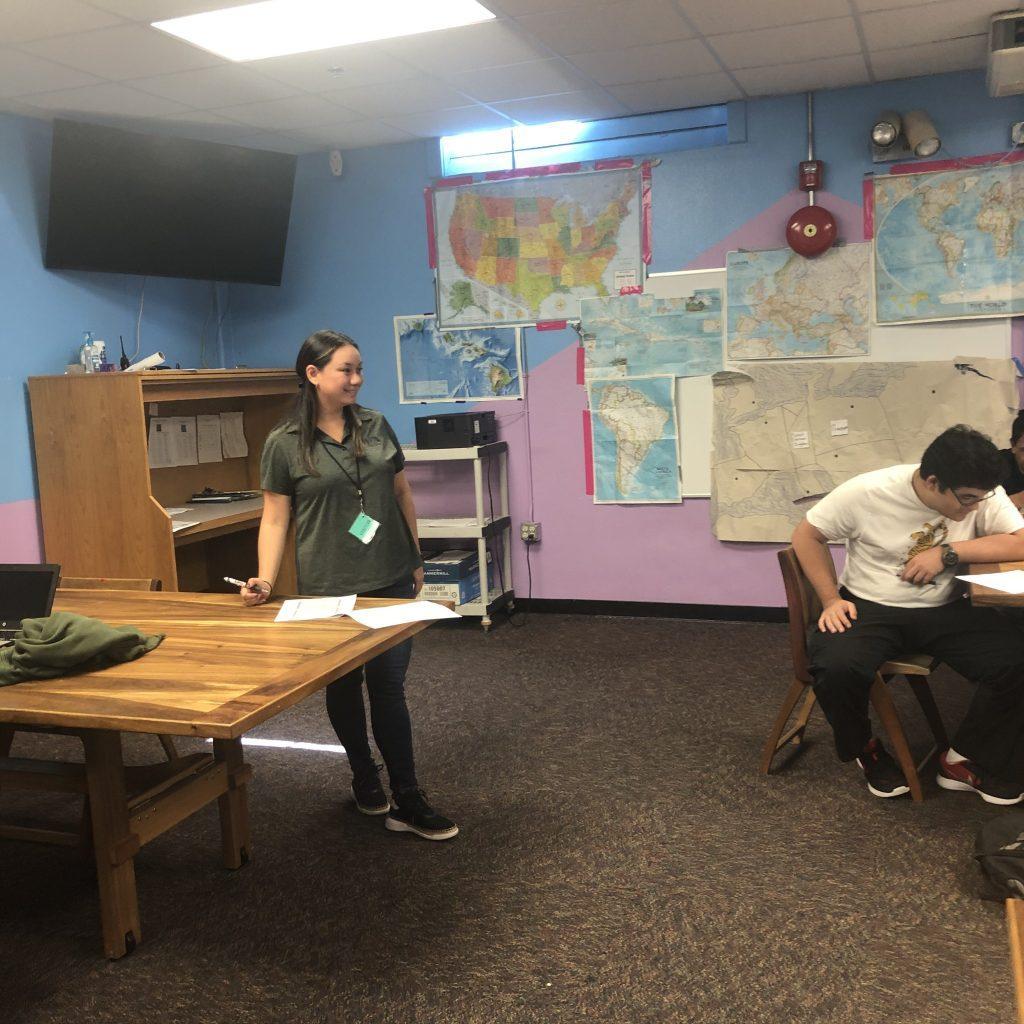 an HFS staff member stands at the front of the classroom delivering a presentation to a group of youth challenge cadets